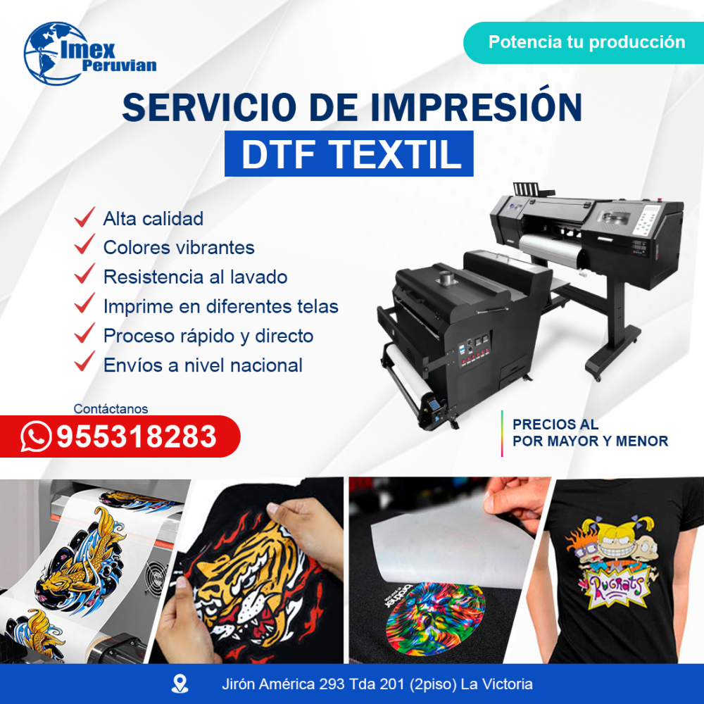 En IMEX PERUVIAN ofrecemos un servicio profesional de impresión DTF textil de alta calidad, ideal para personalizar polos, camisetas deportivas, uniformes, ropa de moda y accesorios.